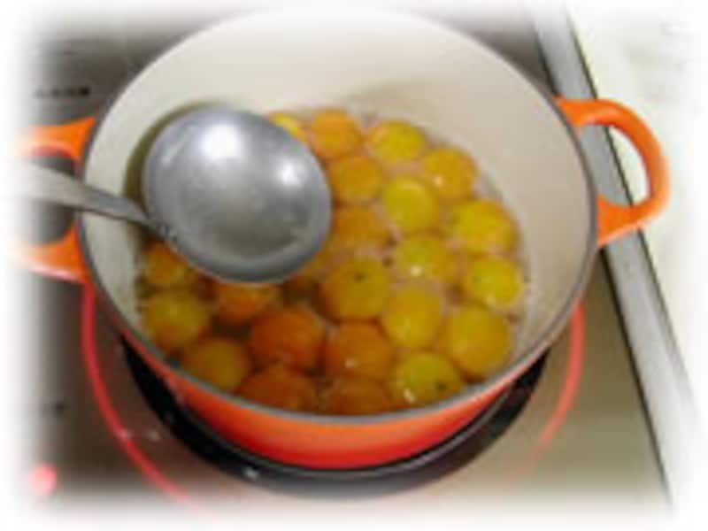 | 7・鍋に水を入れ、中火できんかんを5分程煮ます。まだアクが少し出るようでしたら丁寧に取りのぞきます。 | 8・砂糖の半分を加え蓋をして弱火で15分程煮ます。残りの砂糖を加え再び15分程煮ます。途中焦げないように木ベらを使ってきんかんをそっと上下に返します。 | |||||||||
