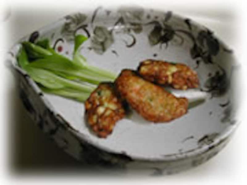 | 美濃焼のどんぶりに、はしりのタラの芽の天ぷらを飾りさつま揚げを並べます。 |