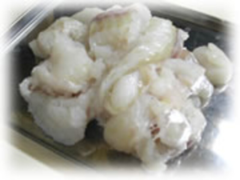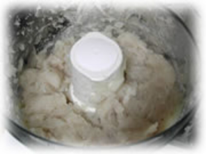 | 1・タラの白身は骨と皮を取り除き、細かく切っておきます。最近はすり身も売られていますが、なんと言っても一匹のタラを下ろして白身を切り分けて作るのが一番です。 | 2・フードプロセッサーにタラの切り身、砂糖、塩、酒、みりん、ショウガ汁を加えてすり潰します。 | |