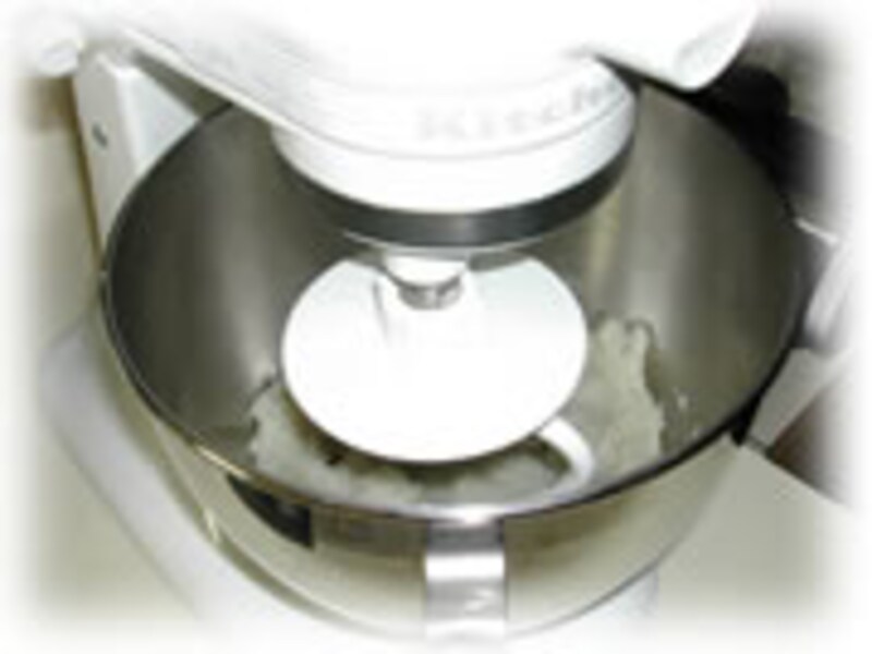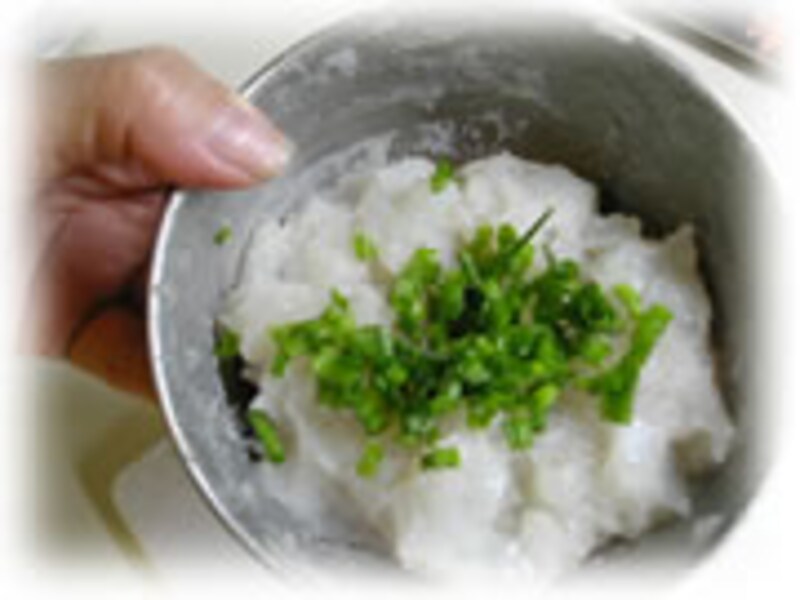 | 3・片栗粉を加えて、さらに滑らかにするためによく練り合わせます。このようにミキサーで練り合わせても、すり鉢で練っても大丈夫です。 | 4・タラのすり身に、ねぎ、人参、ちりめんじゃこなどをお好みで加えます。 | |