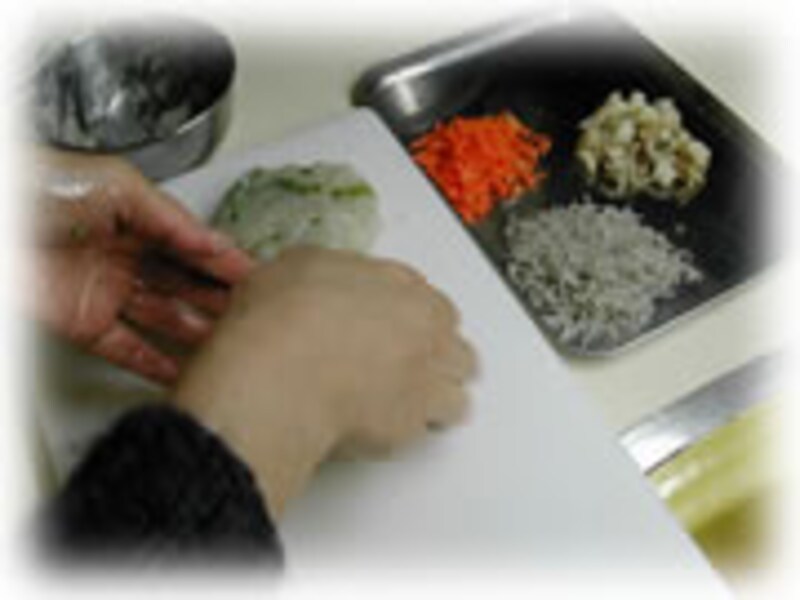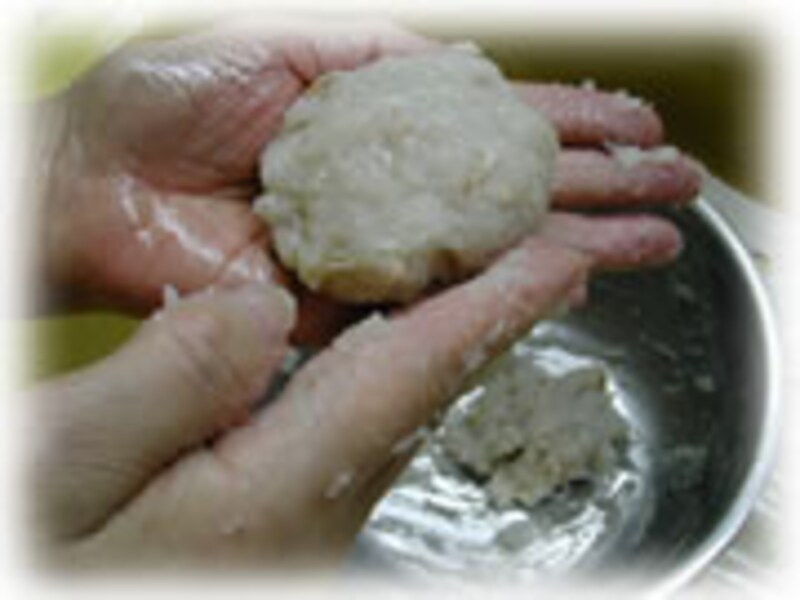 | 5・タラのすり身に、ホタテのみじん切りと、ネギのみじん切りを加えてみました。 | 6・手に少量のサラダ油を塗り、1cmくらいの厚さの小判型に成形します。 | |