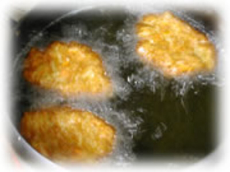 | 7・揚げ油の温度は160度に熱して、きつね色になるまで揚げます。 | 8・揚げたての美味しさは絶品ですよ!! | |
