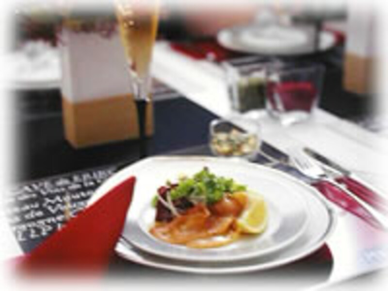 献立:スモークサーモンのサラダ添えマスタードレッシング、カリフラワーのスープ、牛肉の煮込みブラウンソースにライス温野菜を添えて、モンドールチーズ、クラッカー、干し無花果、ドライナッツ、生チョコレート、紅茶、シャンパン、赤ワイン。 | |