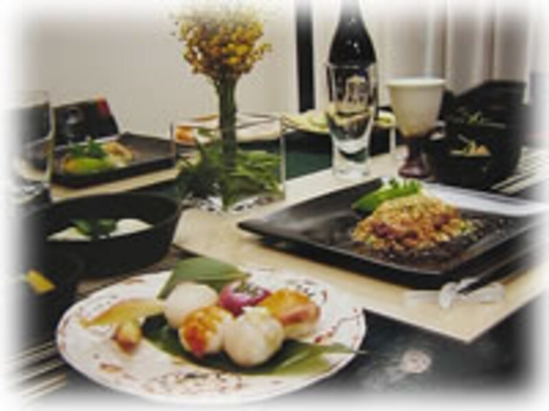 献立:ゴマとバジルの手づくり豆腐、クレソンと柿のサラダゴルゴンゾーラドレッシング、宮崎地鶏の変りパン粉焼き、干しまつもと大根の酢の物、どんこ汁、手まり寿司、白玉だんごのずんだ餡添え。 | |