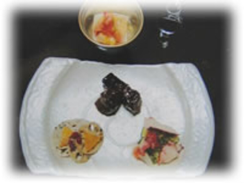 献立:豆乳の前菜、サーモンマリネシャンパン風味、コールドポークプルーン入り、きのこのリゾット、ジンジャートマト、豆腐のレアチーズ、シャンパン、白ワイン。 | |