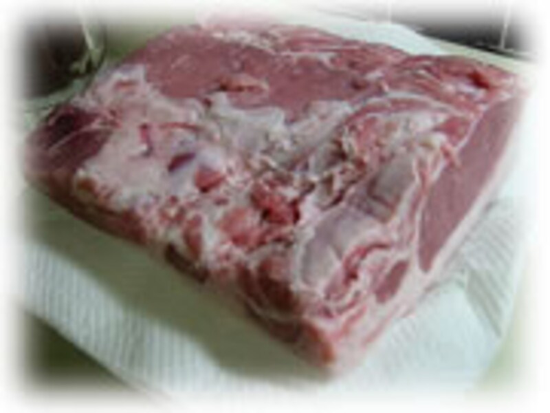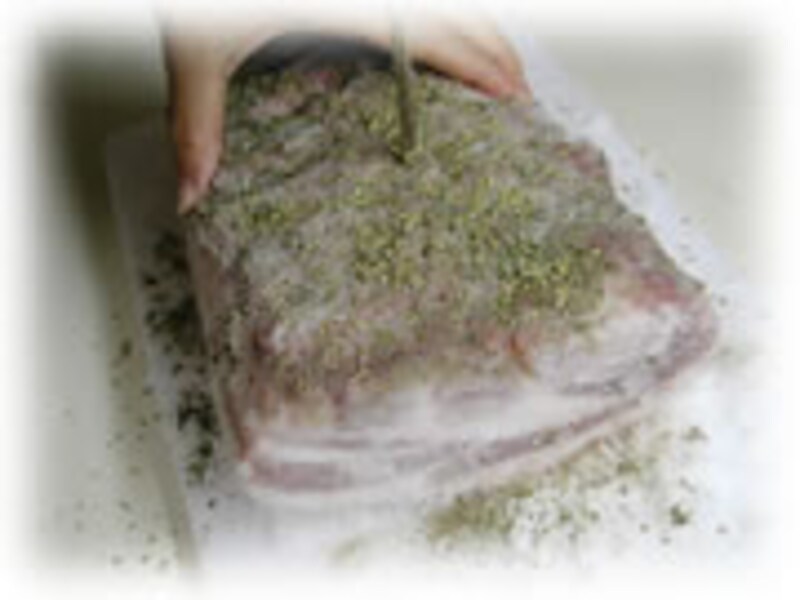 | 1・豚ロース肉は、余分な脂身をとり成形します。水洗いをして水気をよく拭き取ります。 | 2・ボウルに塩、砂糖、コショウ、タイムを合わせておきます。肉の表面にまんべんなく金クシを刺してから、合わせたスパイス類をよくすり込みます。 深めのバットに入れ、上からラップをかぶせ冷蔵庫で2週間程ねかして熟成させます。 |