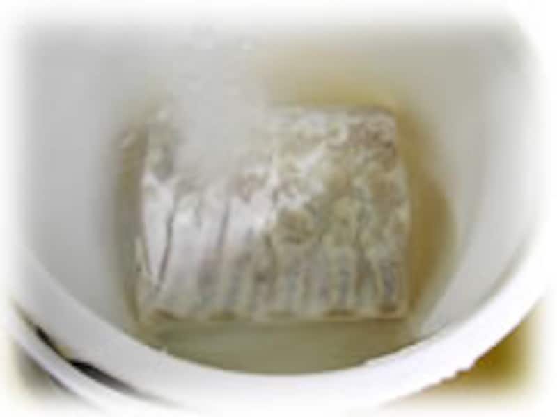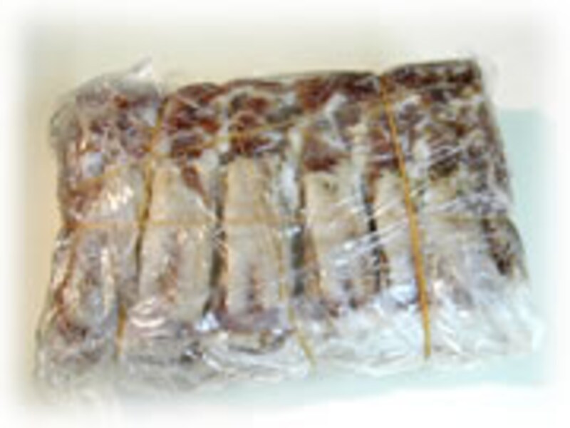 | 3・ポリバケツに水を張り、熟成が終わった肉を入れ、1日ほど水をときどき取りかえて塩抜きをします。 | 4・水気をふきとり、脱水シート(ピチットシート)で包み、1日~2日かけて肉の水分を脱水します。外気温が10度以下の冷たい乾燥した時期なら風乾(外気にさらすこと)しても大丈夫です。 | |