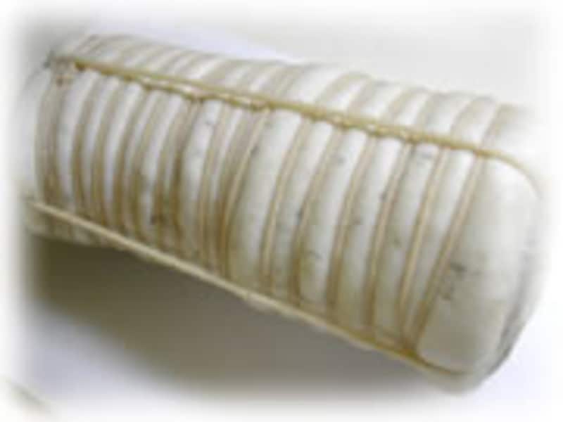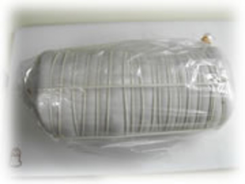 5・脱水を終えた肉を強く丸めてさらしを巻き、太めのたこ糸で端から順に力一杯しばっていきます。この時は清潔な軍手を必ずはめてください。 |