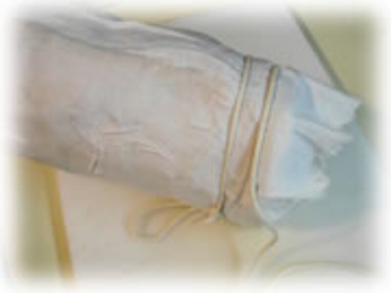 6・さらしで巻いた肉を二重にしたビニール袋に入れ、中の空気を抜いて口を輪ゴムでしっかりと結びます。 肉の旨味を逃がさないようにするためです。 |