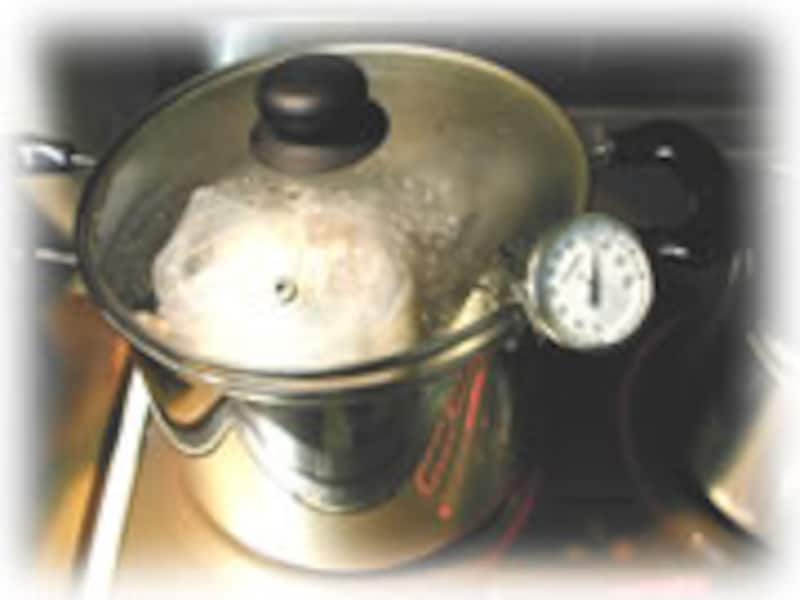 | 7・大きめの鍋にたっぷりの水を張り、ビニル袋に入れたまま肉を入れてます。70~75度になるまでゆっくり加熱し、3時間の間温度を保ちながらボイルします。 | 8・ボイルし終わった肉は、ビニール袋に入れたままで粗熱を取り、充分冷めてから冷蔵庫で一晩ねかせます。 | |