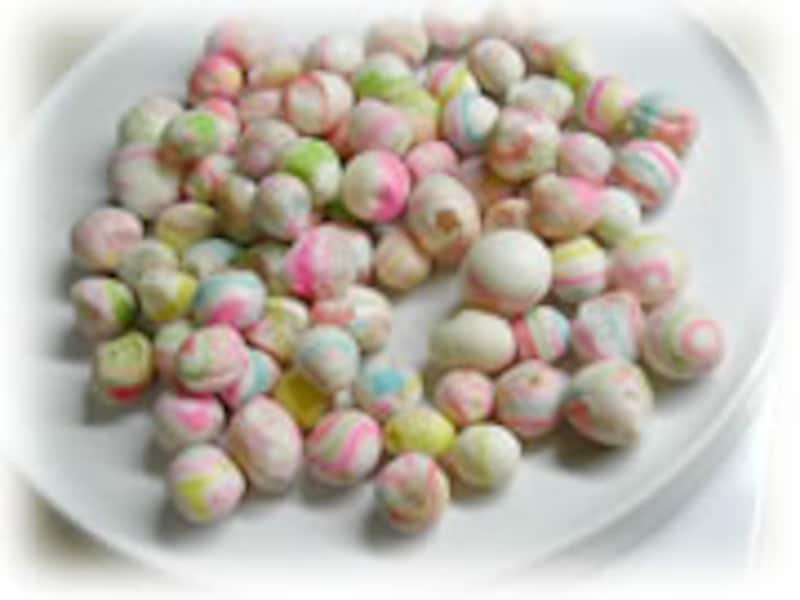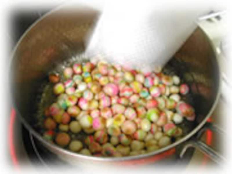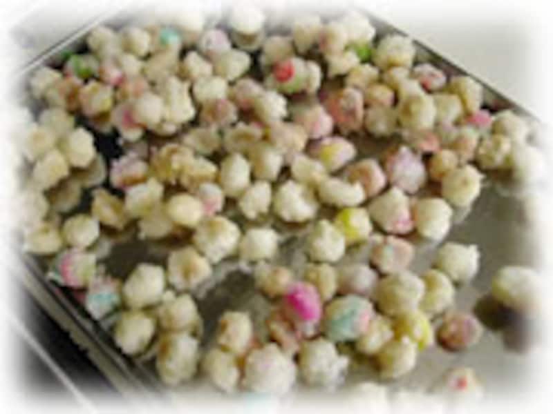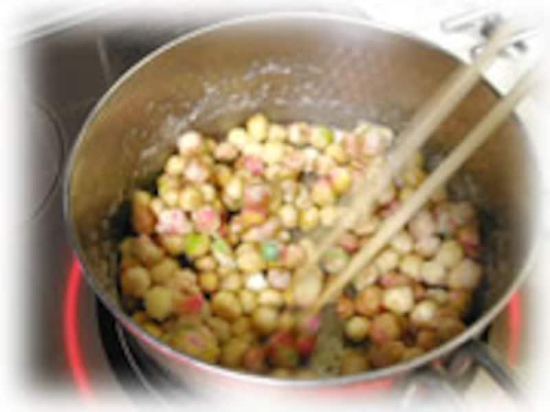 | 6・箸で砂糖蜜が絡まるようによく混ぜ合わせます。からめ合わせる程度で、ひなあられの白さが違ってきます。 |