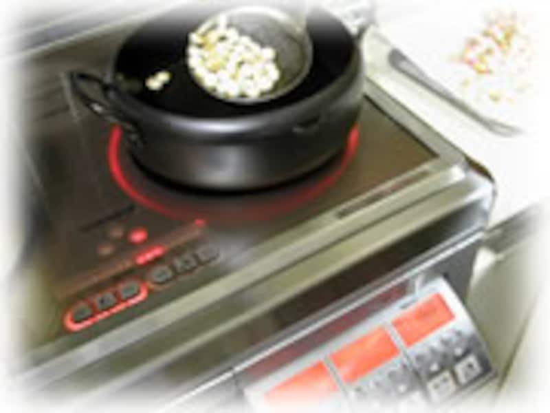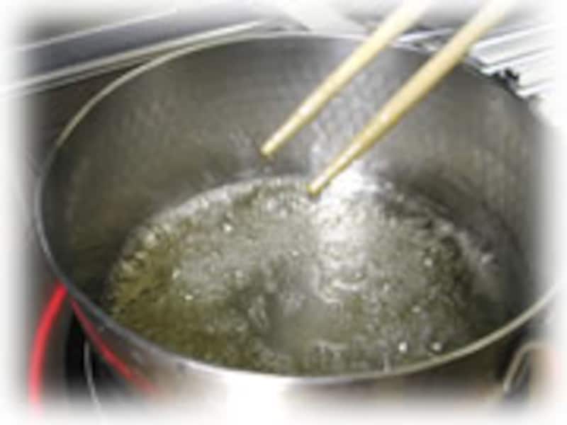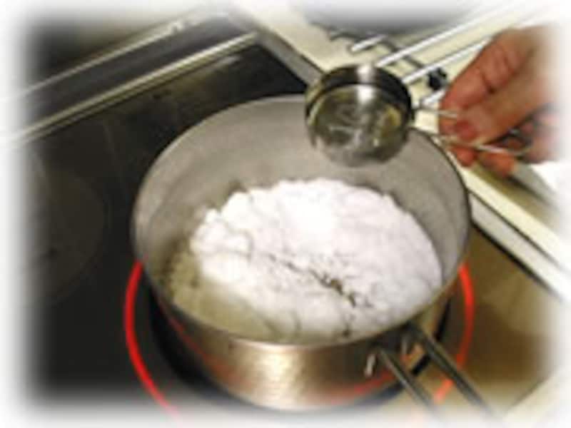 | 2・170度の油でサッと揚げ、キッチンペーパーで油を切ります。 | 3・上白糖に水を加え、強火で鍋をゆすりながら砂糖を溶かします。 | |