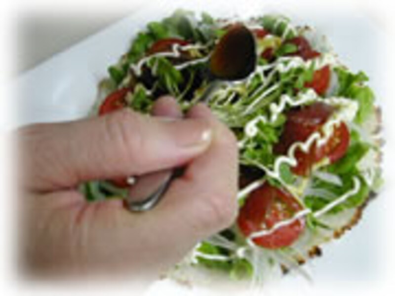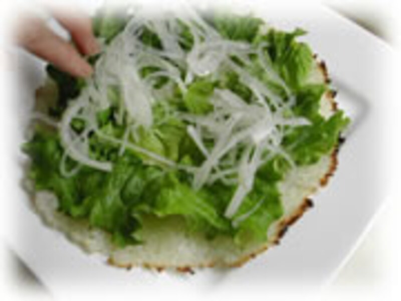 8・よく水切りをしたレタスやタマネギのスライスを盛り付けます。 |