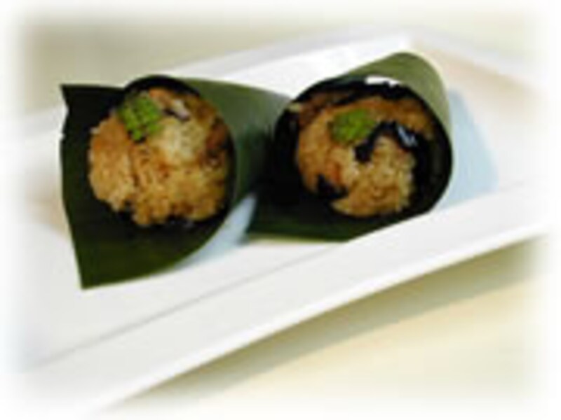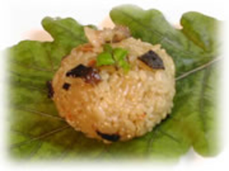 | ササの葉や竹皮などで包む中華チマキもいいですね。 | かしわ餅につかう柏の葉で包んでみるのも趣が変わって、お弁当にも喜ばれます。 | |