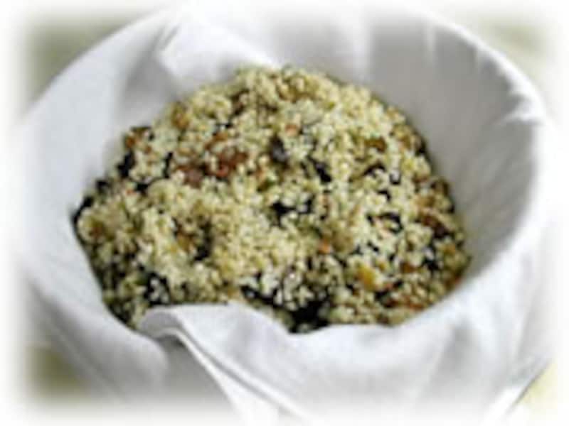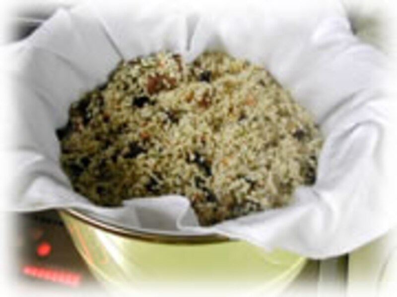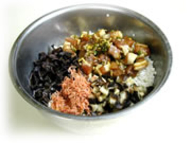| 3・ボールに水気を切ったもち米、調味料につけた豚肉とつけ汁、それぞれ1cm角に切ったシイタケ、キクラゲ、茹でタケノコ、干しえび、シイタケの戻し汁を合わせて、2時間程つけておきます。 | 4・下にボールをおき、ざるに大きめの布巾を広げ味がしみ込んだおこわの材料を入れます。 残ったつけ汁は取っておきます。 |