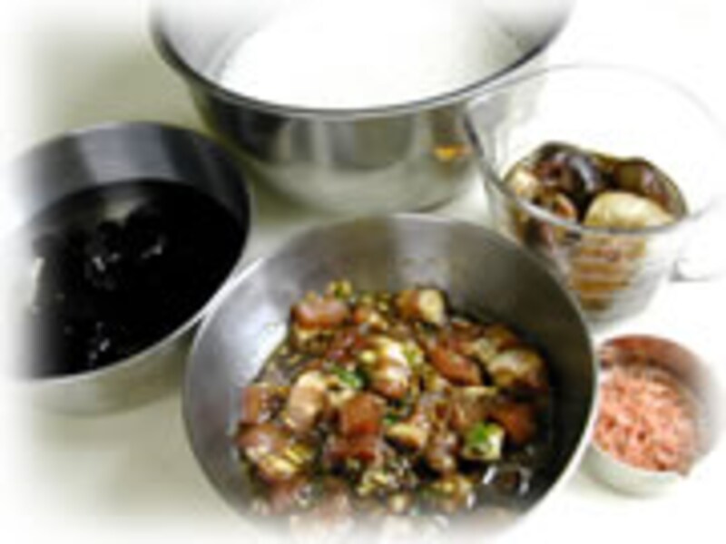 | 1・もち米は一晩水につけておき、ザルに上げて水気を切ります。 シイタケは300ccの水で戻しておきます。シイタケの戻し汁は取っておきます。きくらげも水で戻しておきます。 |