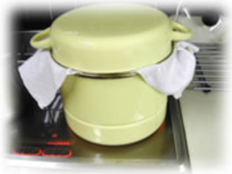 | 5・湯気の上がった蒸し器に布巾ごと入れます。 |