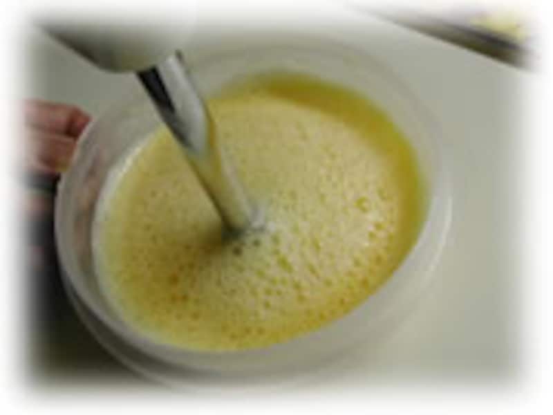 | 1・材料を切りそろえておきます。 | 2・全卵は泡立て器を使って、ときほぐします。 | |