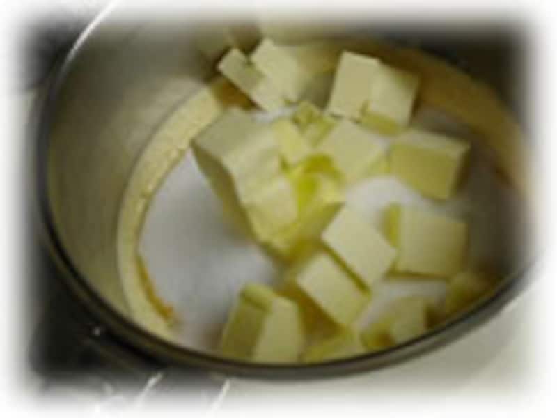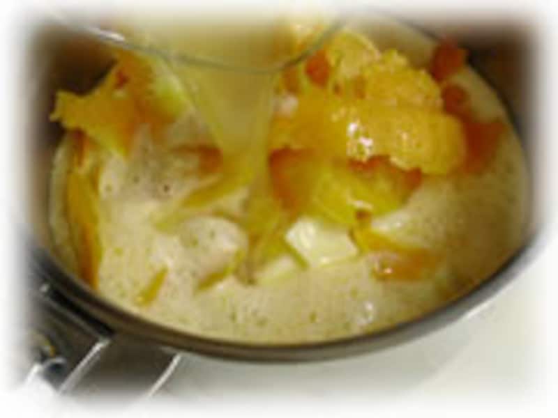 | 3・湯煎にかけられるボールに、ときほぐした卵、砂糖、バターを加えます。 | 4・うすくそいだみかんの表皮と絞り汁も加えます。 | |