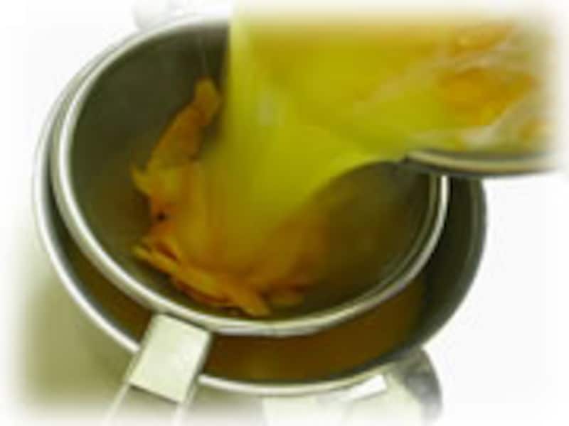 | 5・60度前後のお湯で湯煎をしながら、バターと砂糖が溶けるまで、ゆっくりとかき混ぜます。 | 6・別のボールにザルをおき一度漉します。 みかんの皮は取り除きます。 | |
