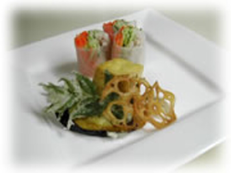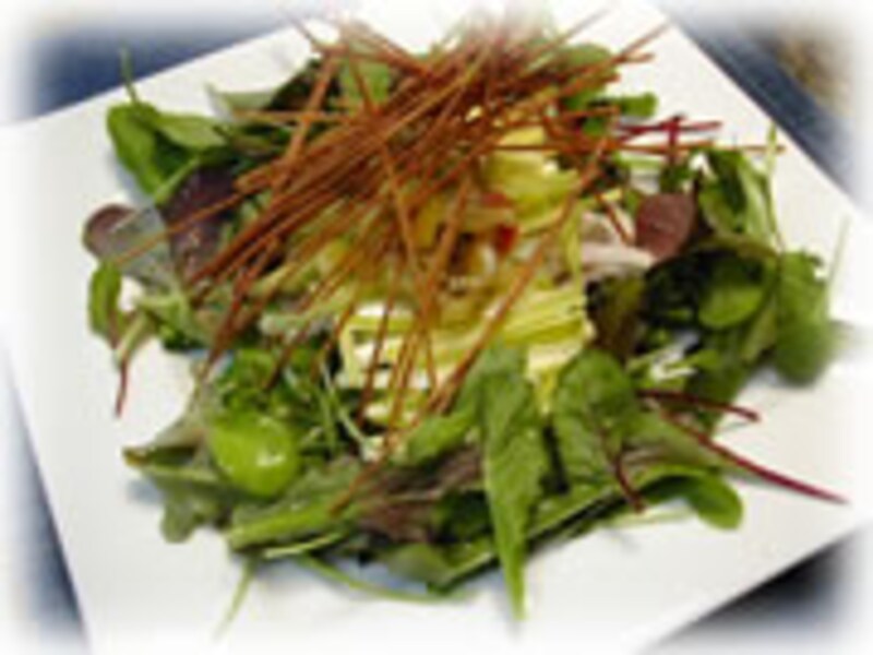 | 黄ニラ、ベビーリーフ、パスタの空揚げ、松の実のサラダ。お好みのドレッシングで召し上がって下さい。 | 黄ニラの生春巻きと野菜の天ぷら。生春巻きの皮に細切りした野菜を包みたれをつけていただきます。 |