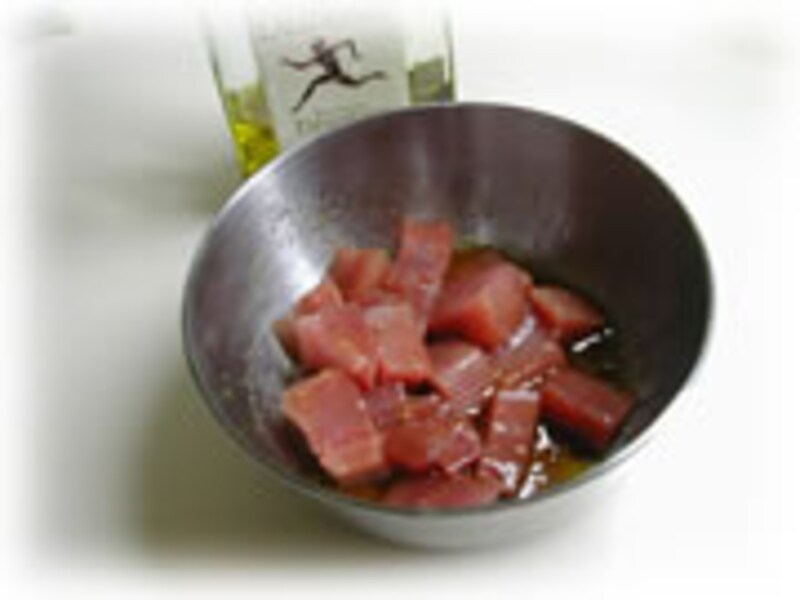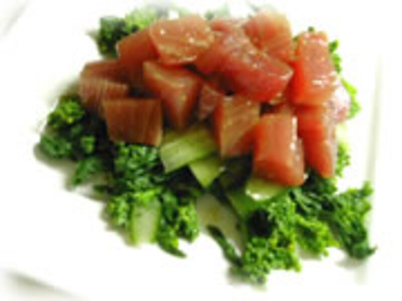 | 1・刺身用マグロは醤油、わさび、オリーブオイルに30分程漬け込んでおきます。 | 2・茹でた菜の花の水気を切り、食べやすい大きさに切った上にマグロを漬け汁ごとのせます。 | |