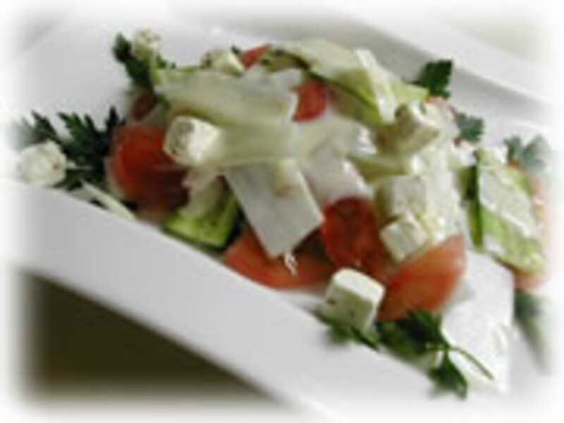 | 3・ウド、水菜、きゅうり、トマト、フェタチーズを白味噌マヨネーズで和えたサラダです。 | 4・ベビーリーフの上にウドのスライスをのせ、酢みそ(マヨネーズを加えない)を添えた一品。 | |