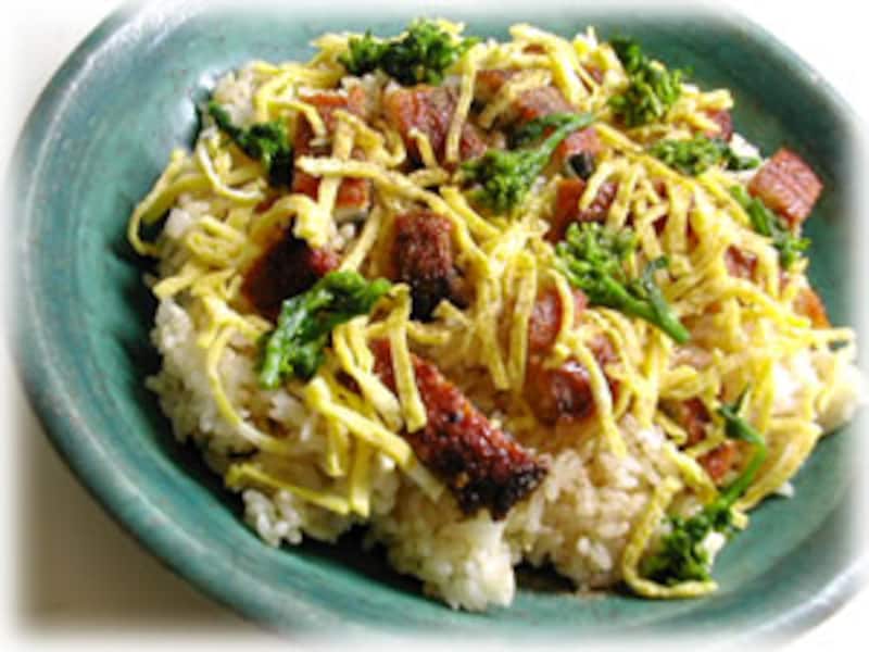 [ 菜の花と鰻のちらし寿司 ] 鰻の蒲焼きを使って ひつまぶし風の 菜の花と鰻のちらし寿司 輝くような太陽のもとで 思いっきり遊んだ後は こんなお手軽料理もいいかしら・・・。 ■ 菜の花と鰻のちらし寿司(4人分)■ ● 米 2カップ ● 水 2カップ ● ダシ昆布 10cm ● 鰻の蒲焼き 1匹分 ● 合わせ酢 ● 酢 大さじ3 ● 蒲焼きのタレ 2袋(約20ml) ● 卵 3個 ● 菜の花 一束 ● 薄口醤油 小さじ1 ● お好みで白ゴマ、刻み海苔など 適宜 (C)Apr..2004 Copyright & Photo. Tamiko Kuroda 12次のページへ