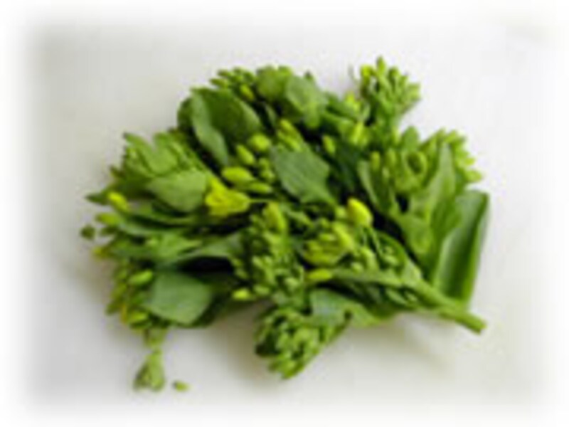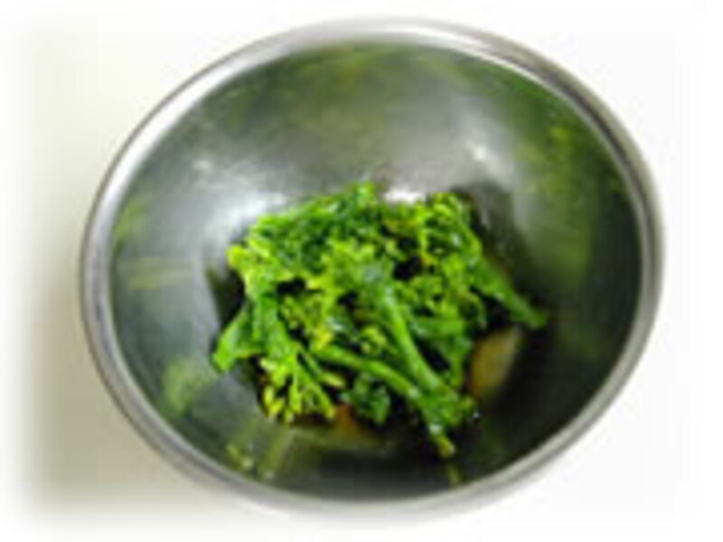 | 1・菜の花は塩をひとつまみ入れたお湯で色よく茹でておきます。 | 2・茹でた菜の花は薄口醤油小さじ1で下味を浸けておきます。 | |