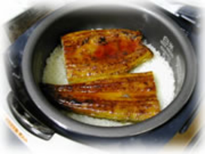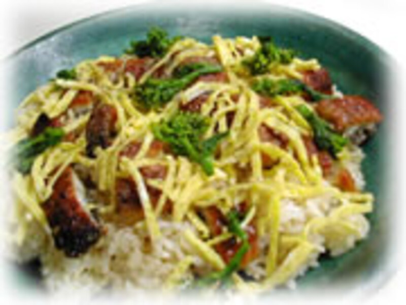 | 3・卵3個を割りほぐし、砂糖大さじ1と塩小さじ1/2を加えて薄く焼き、錦糸卵をつくります。 | 4・だし昆布を入れてお米を炊きます。炊きあがり蒸らしている間に鰻の蒲焼きをごはんの上におき、酒大さじ1を鰻の上に振りかけて鰻も柔らかく温めます。 | |
