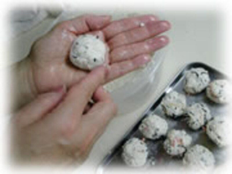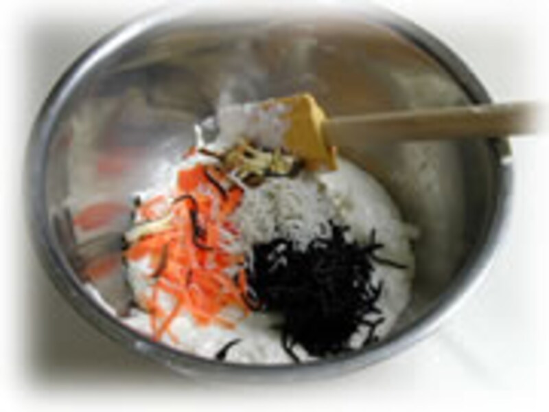 | 1・豆腐、おから、大和芋をミキサーでよく混ぜ合わせます。人参、ひじき、ちりめんじゃこ、塩を加えて混ぜ合わせます。 | 2・手の平にサラダ油を塗り、がんもの材料を手に取り丸くまるめます。 | |||||||||||||||||||||