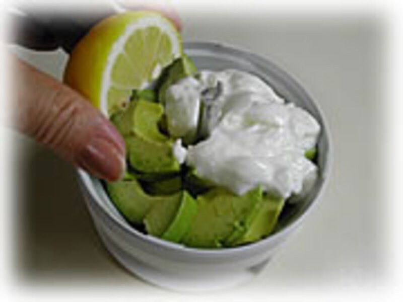 2・フードプロセッサーにアボカド、ヨーグルト、レモンの絞り汁、醤油を加えてすり潰します。
