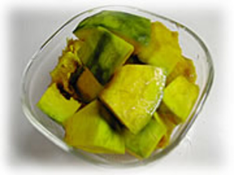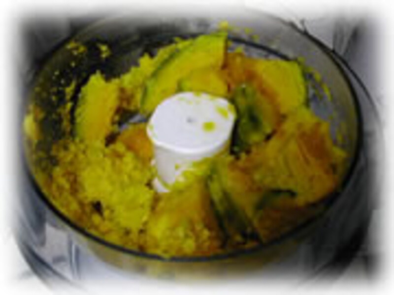 | 1・カボチャは1cm位に切り電子レンジで約3分かけて柔らかくします。 | 2・フードプロセッサーにカボチャ、マヨネーズ、生クリーム加えすり潰します。最後にレーズンを加えます。 | |||||||||