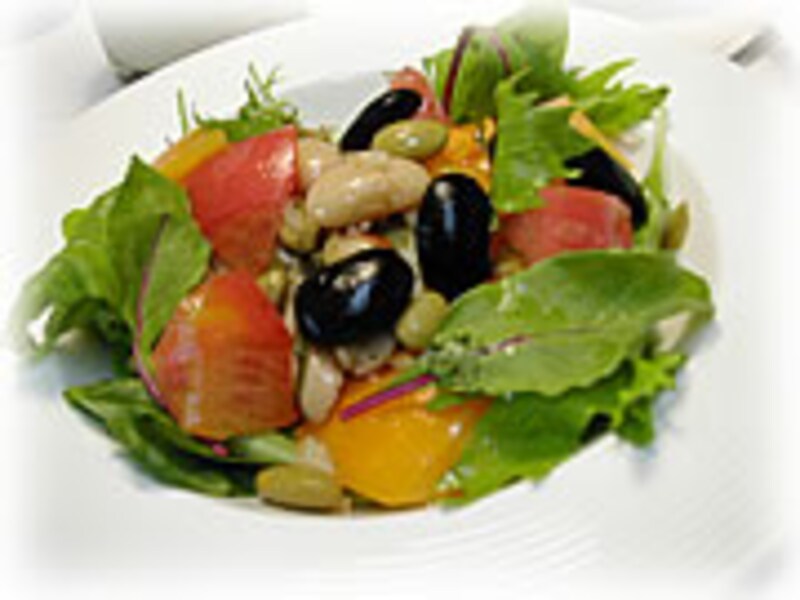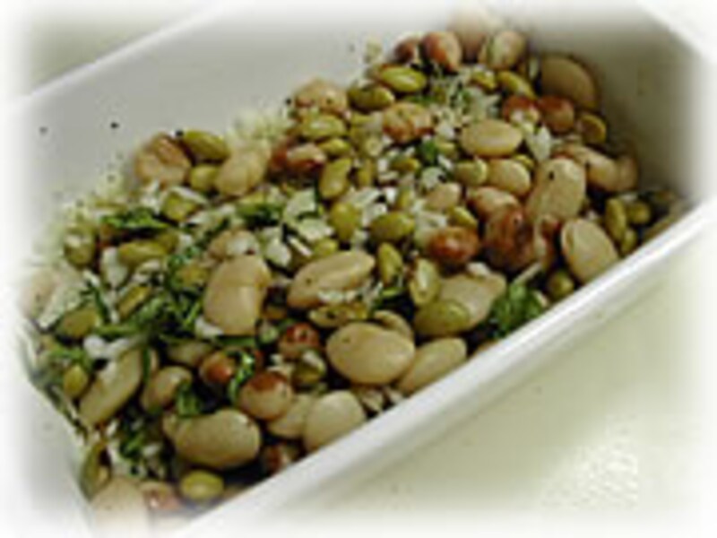 | 保存容器に茹でた豆を入れ、ドレッシングをたっぷりと振りかけて混ぜ合わせ冷蔵庫で保存します。一週間くらいで食べ切るようにしてください。 | 朝食には生野菜と豆のドレッシング漬けをのせ、お好みでハムやチーズをトッピングしてください。全体にドレッシングを振りかけて味を整えてください。 | |