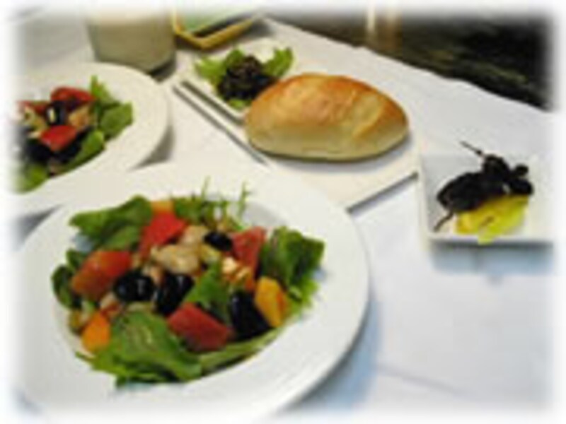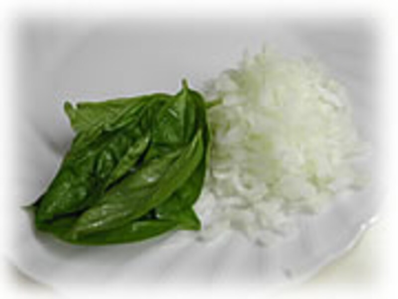 | 普通の鍋で豆を煮るときは強火にかけ、沸騰したら弱火で約45分程煮ます。 | ドレッシングを作ります。タマネギはみじん切り、バジルの葉は千切りにします。ドレッシングの材料とビンに入れ、良く振って合わせておきます。 | |