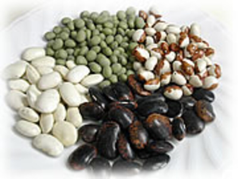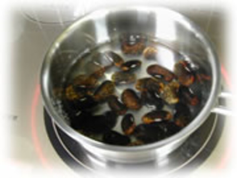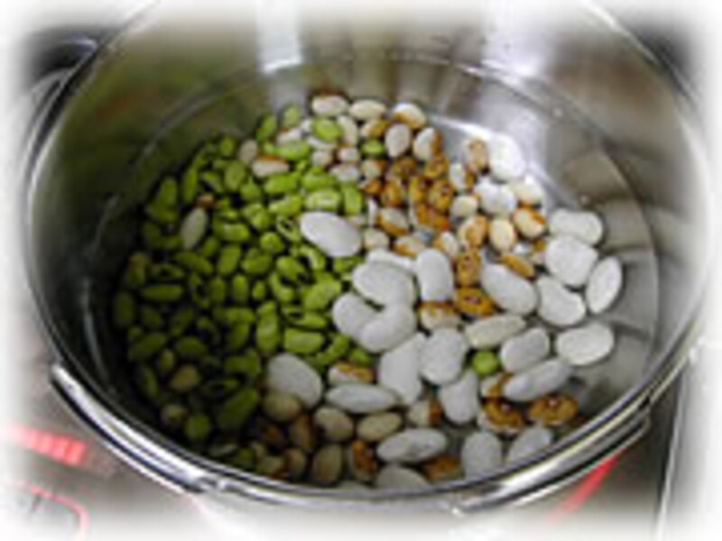 | 水に浸けておいた豆は、色の出る紫花豆のような豆以外は一緒に煮ても大丈夫です。 |