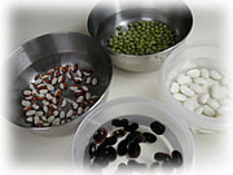 | 豆は手に入りやすいものならなんでもOKです。 | 豆は2倍の水に一晩浸けて柔らかくします。豆は水に浸けておくと色が出るので別々に浸します。 | |