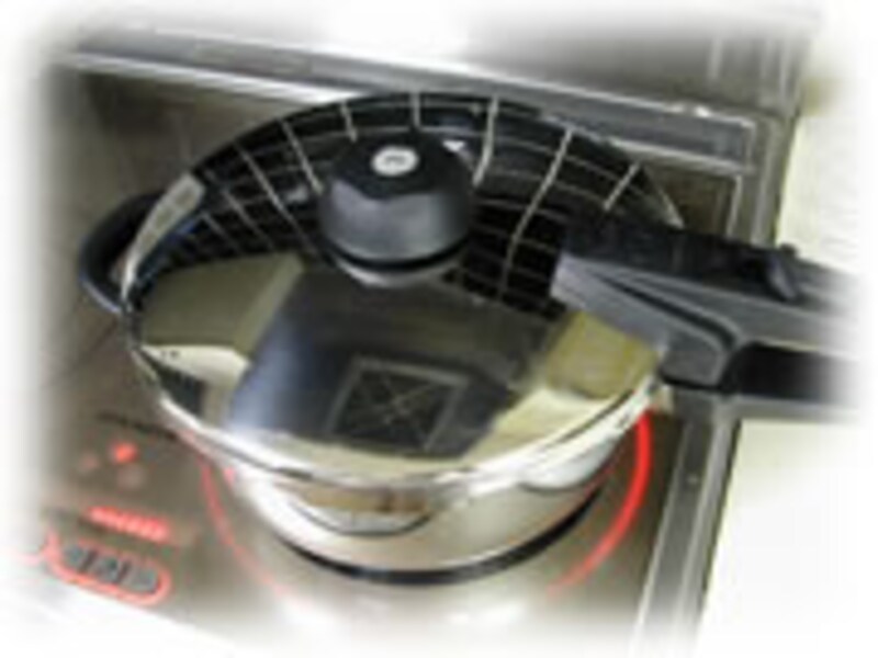 フィスラーの圧力鍋を強火にかけ、高圧状態になったら弱火にして5分加熱します。火を止め圧力を抜いてから蓋をあけ豆をザルにあけます。10分たらずでお豆が煮上がる圧力鍋は、光熱費が気になる主婦の心強い味方ですね。 | |