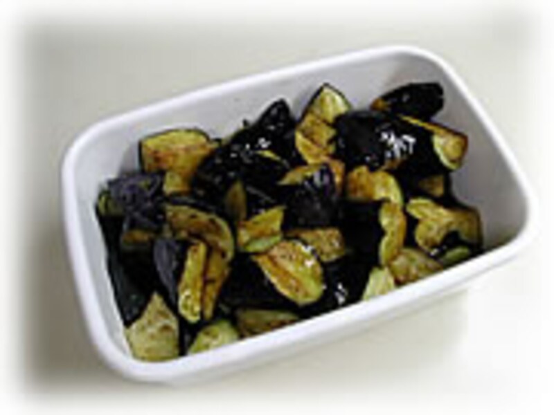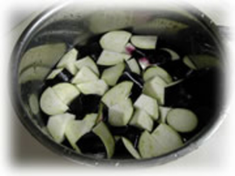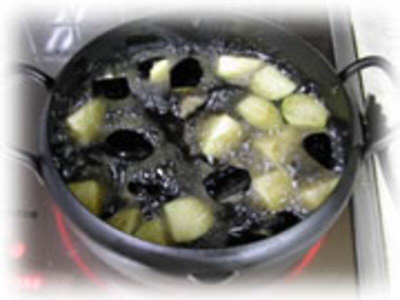 | ナスは食べやすい大きさに乱切りにし、水に5分程度つけてアク抜きをします。 | 水気を切ったナスを素揚げします。 | |