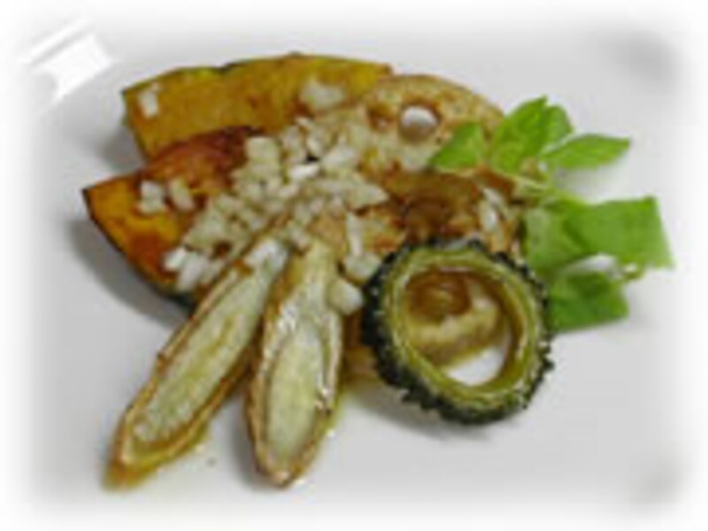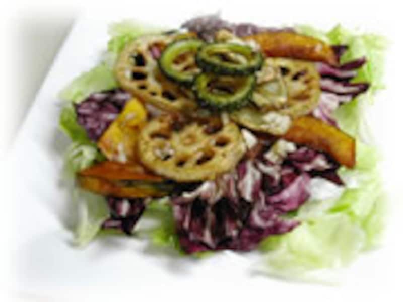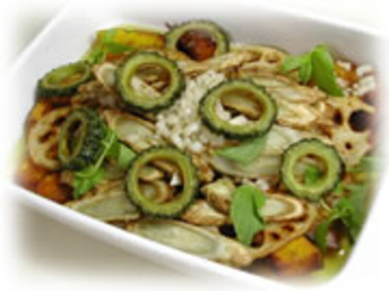 | かぼちゃのほっこりした甘味、蓮根やごぼうのしゃきっとした歯ごたえ、ビタミンたっぷりのゴーヤのヘルシー野菜のマリネはお肌の回復にとても嬉しいメニューです♪ | ||