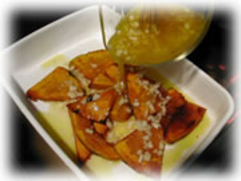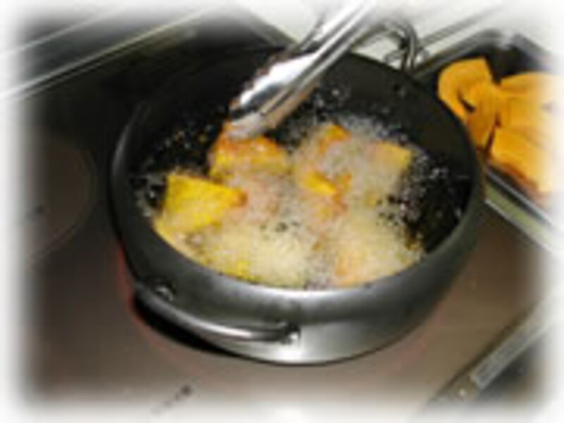 | 1・かぼちゃは皮をむき8mmくらいの厚さのくし型に切ります。170度の油で素揚げます。 | 2・バットに揚げあがったかぼちゃの油を切りマリネ液をかけておきます。 | |