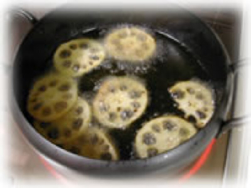 | 3・蓮根は5mm位の厚さに切り同じく170度の油で素揚げします。ごぼう、ゴーヤも同じように素揚げします。 | 4・素揚げして油を切った野菜を順にマリネ液を振りかけて味をしみ込ませます。 30分ほど漬け込めばでき上がりです。 | |