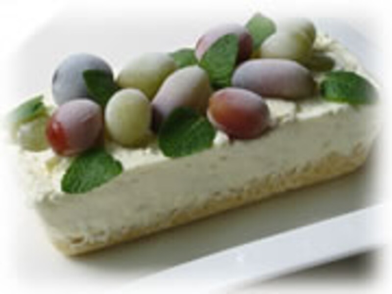 細長い形のうす紅色のマニキュアフィンガー、黒くて大きなピオーネ、巨峰、淡い黄緑色の翠峰、ロザリオ、淡いワイン色のルビーオクヤマなど旬を楽しむぶどうのかずかずが山梨から届きました。皮をむいたぶどうをレアチーズケーキの間にはさみ凍らせたぶどうをトッピングしてみました。 濃厚なチーズの風味と甘いぶどうがマッチする素敵なケーキができました♪ |