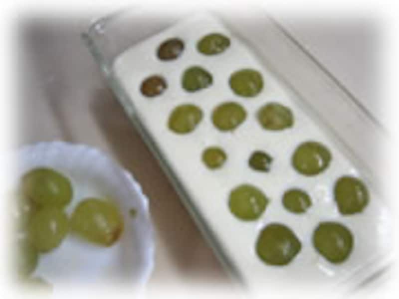| 7・皮をむいたぶどうを並べ上から残りのクリームチーズ液を流し込み冷蔵庫で2時間ほど冷やし固めます。 | 8・いろんなぶどうやミントの葉をトッピングして飾ります。(ぶどうは冷凍して半解凍状態です) | |