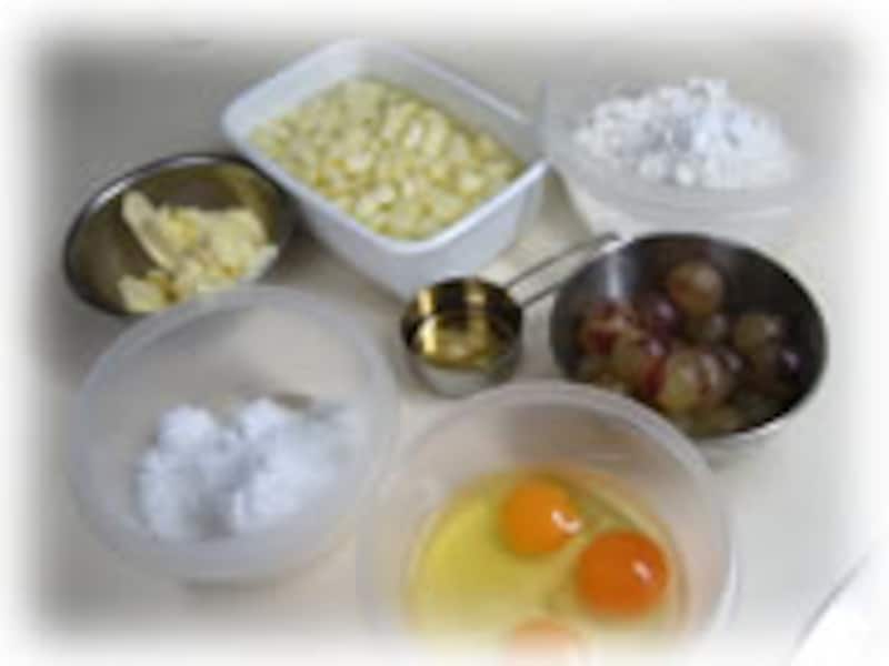 | 1・薄力粉とベーキングパウダーは合わせて振るっておきます。りんごは皮をむき、いちょう切りにし塩水につけておきます。ぶどうは皮をむいておきます。卵は溶きほぐしておきます。 | 2・常温に戻して柔らかくなったバターに砂糖を3回くらいに分けて加え、ハンドミキサーでよく混ぜ合わせます。 | |