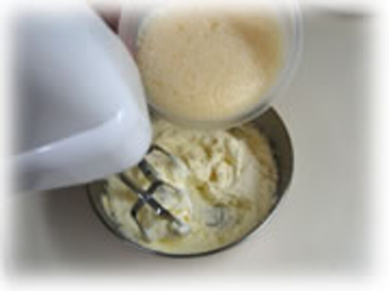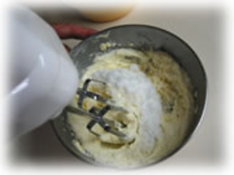 | 5・振るっておいた粉を2回に分けて加え、混ぜ合わせます。 | 6・テフロン加工したケーキ型に流し入れ、トントンと中の空気を抜きます。表面を平にします。 | |
