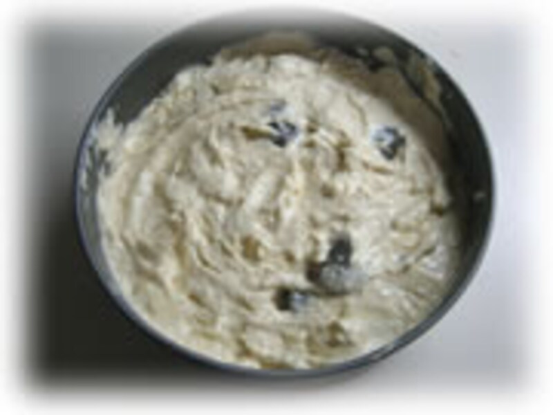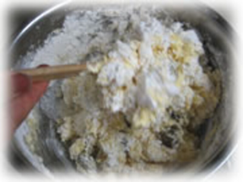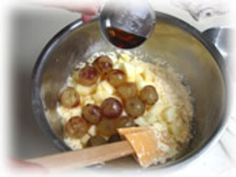 | 3・次に溶きほぐした卵を少しずつ加えよく混ぜ合わせます。 | 4・水切りしたリンゴ、ぶどう、ブランディーを加え混ぜ合わせます。 | |
