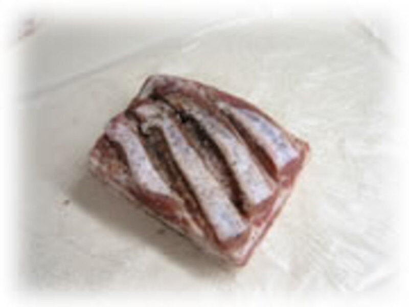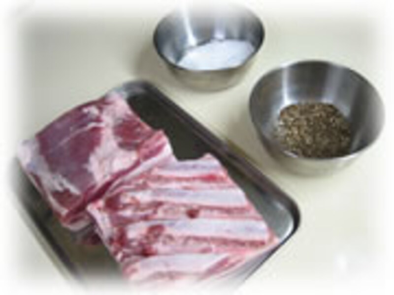 | 1・豚バラ肉は燻製する中華鍋の大きさに合わせて切り分けてください。 | 2・塩を全面によくすり込みます。コショウも同じく全面によくすり込みます。 | |