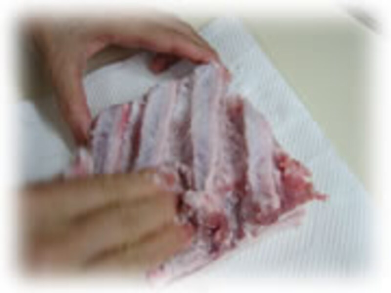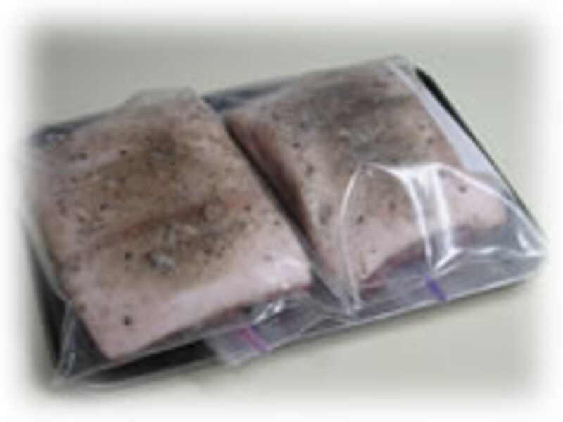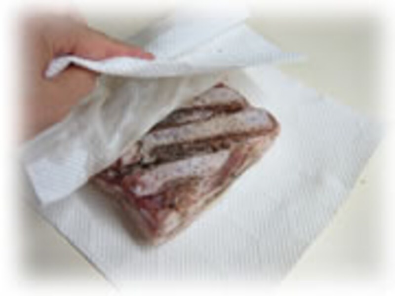 | 3・ビニール袋に入れ2時間ほど冷蔵庫で塩漬けします。 | 4・肉に塩、コショウが染み込み水分が出てきました。キッチンペーパーで水気をふき取ります。 | |