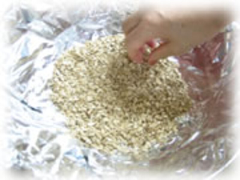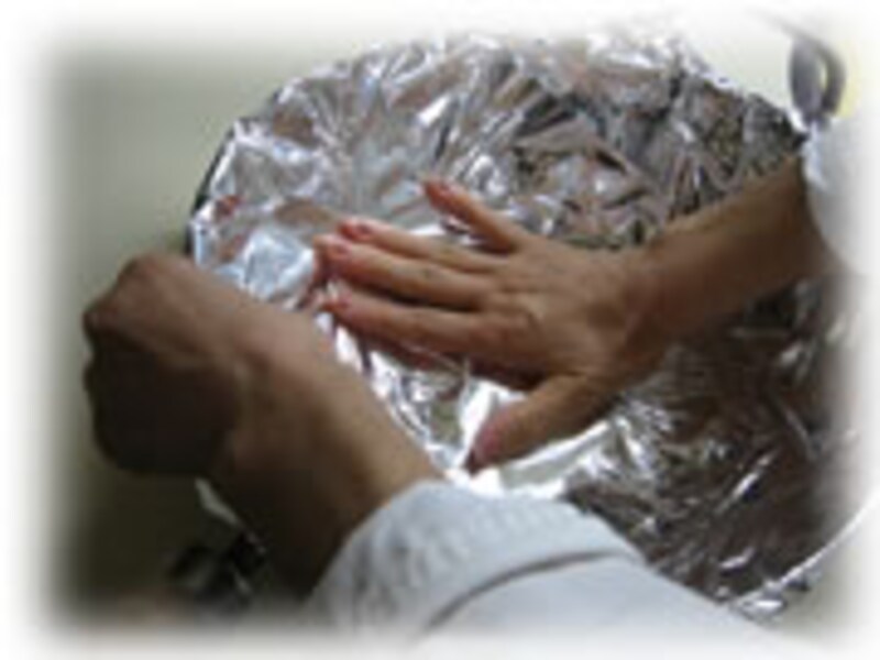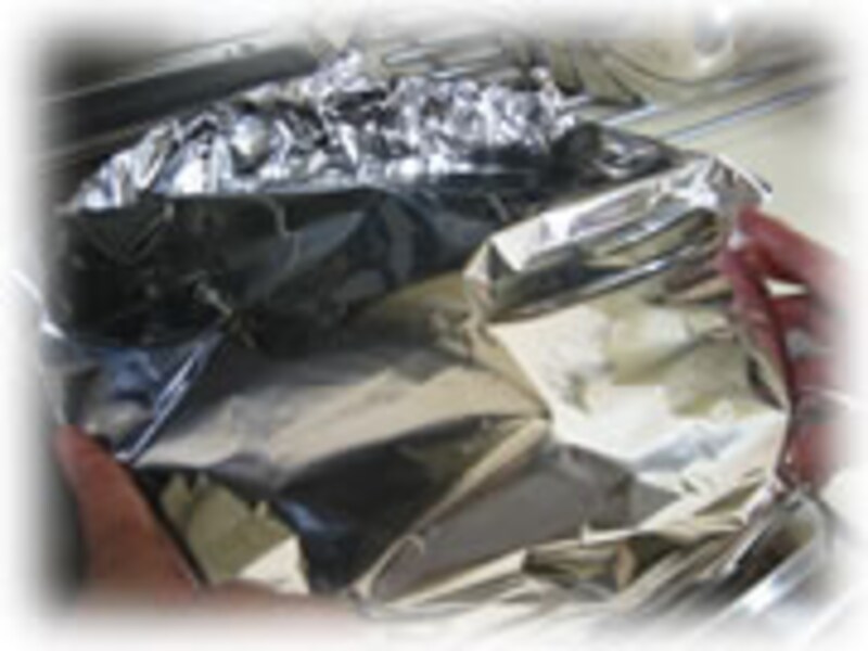 | 5・次に脱水シートに包み半日冷蔵庫で脱水します。(水分を取り除く、風乾の代りに脱水シートを使います) | 6・さあ!いよいよ燻煙です。燻製に使う中華鍋はアルミホイルできっちりおおいます。 | |